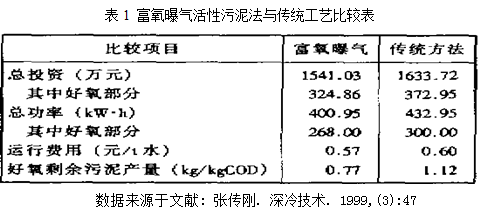 表1是某企業(yè)采用富氧曝氣活性污泥法與傳統(tǒng)工藝的比較實例,其中廢水排放量7500m3/d,COD3850mg/L,要求出水COD小于250mg/L。從該表可以看出:總投資減少90多萬元、總功率減少60多KW,運行費用減少5%,好氧剩余污泥產量減少31%。富氧曝氣生物污水處理技術可用于處理廢水和含油污泥等,主要有如下優(yōu)點: