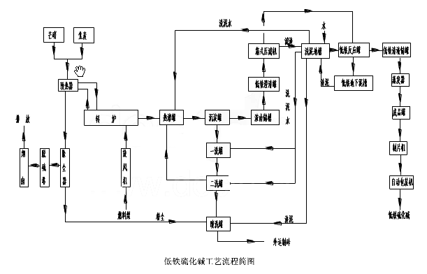 將原料硝(元明粉)和無煙煤按一定比例混合后,高溫煅燒取硫化鈉堿坯,熱溶后得硫化鈉半成品溶液,再將配好的硫化鈉、硫酸鋅溶液,加主硫化鈉半成品溶液中進(jìn)行除雜,沉淀澄清后的硫化鈉溶液,經(jīng)蒸發(fā)濃縮、制片包裝,即得成品。