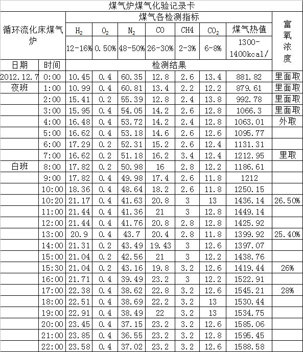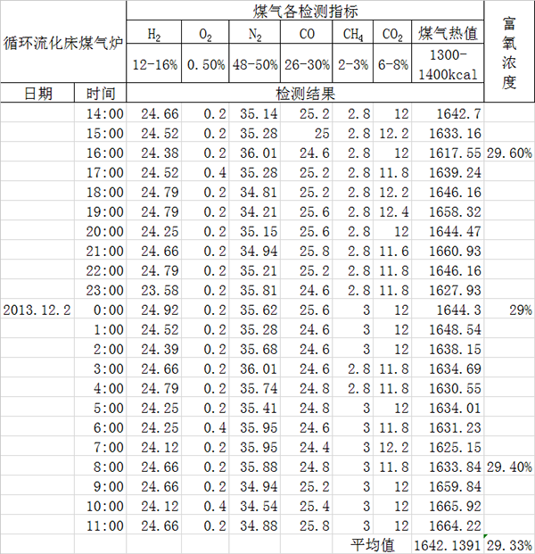 循環(huán)流化床煤氣發(fā)生爐富氧氣化數(shù)據(jù)表